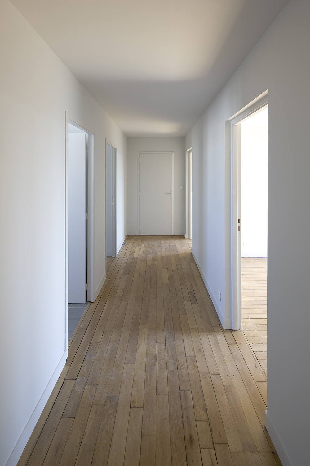 Nous avons réalisé la refonte complète des typologies de logements : restucturation lourde en site occupé : deux phases de 9 et 10 mois de chantier, avec opération «tiroir». Ainsi que la mise aux normes complète du bâtiment, la création d’ascenseurs et de colonnes montantes, la révision de la toiture en tuiles mécaniques et des balcons, le ravalement de l’ensemble de la cour, le remplacement des menuiseries extérieures et la rénovation des persiennes.