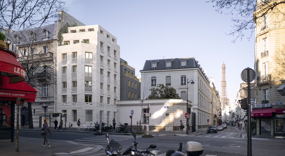 _Un bâtiment sur rue, qui à l’échelle du boulevard de la Tour Maubourg, permet une continuité avec la ville tout en créant une articulation vers l’intérieur de l’ilôt. Le bâtiment est réalisé en pierre massive structurelle et forme une continuité contemporaine entre les facades des immeubles existants.