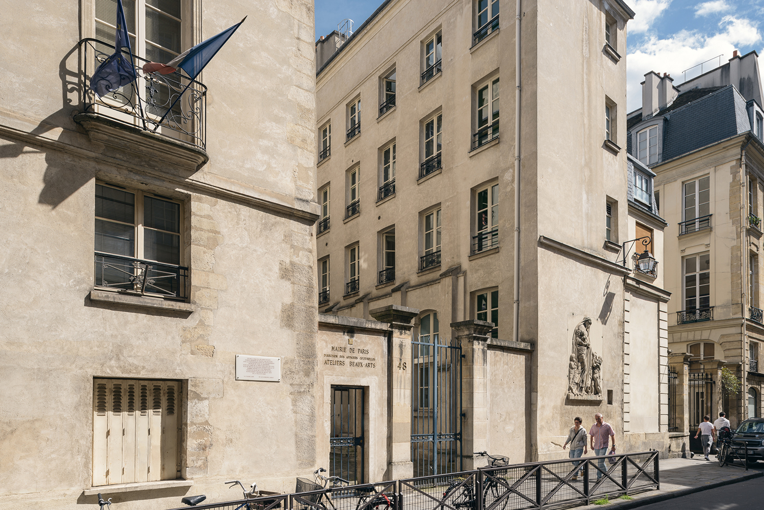 Bet Structure : JC LouisPhotographeAntoine HuotLe projet a consisté à réhabiliter un hôtel particulier du secteur sauvegardé du Marais pour abriter l'Ecole des Beaux-arts de la Ville de Paris. Une des façades étant classée à l’Inventaire Supplémentaire des Monuments Historiques, le parti pris du projet a consisté à reprendre les façades et les menuiseries dans le style originel, tout en réalisant un grand atelier par étage dans une facture contemporaine. Le plafond du dernier niveau, de grande hauteur, bénéficie d’un traitement «fractal» qui oriente la lumière naturelle en la diffusant sur les modèles de l’atelier de dessin.