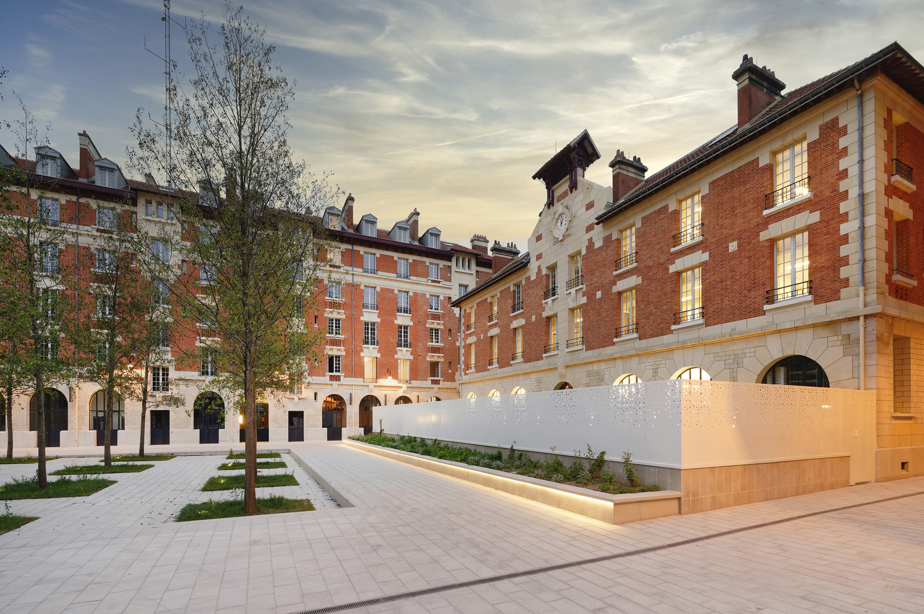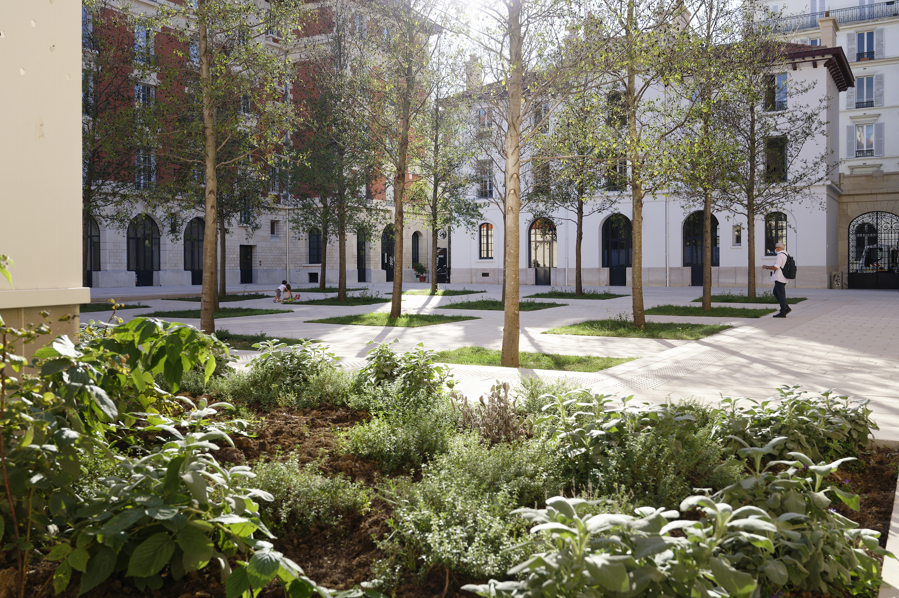 Nous avons mené une réflexion qui va au-delà de la restructuration de cet ensemble patrimonial. Repenser les porosités et les continuités urbaines, mais également paysagères et de services sont les enjeux que nous avons défendus. Le mur d’enceinte est supprimé, les soubassements sont percés. La cour centrale devient un jardin de fraîcheur, traversant et animé.