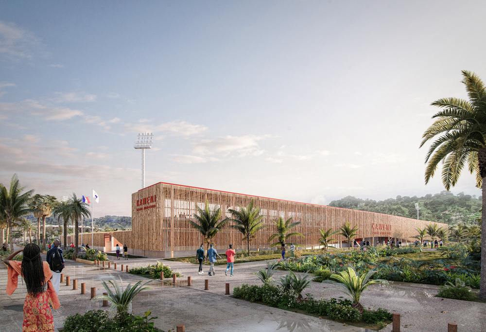 Bet VRD & Sport : AltairLe site du stade s’inscrit entre deux contextes bien distincts : au Nord, un espace naturel marqué par une végétation luxuriante. Au Sud, le tissu urbain du quartier de Kawéni, en plein renouvellement urbain. Le projet architectural porte l’ambition de constituer un lien entre ces deux entités. L’idée fondatrice est de créer une architecture poreuse, qui entre en interaction avec son environnement, grâce à des percées visuelles.